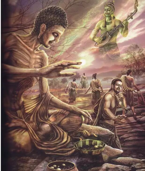悉达多苦行寂定六年,甚至到了日食日食一麻一麦的程度,但他仍觉此道亦不究竟,并没有达到他出家的目的,见天神于空中弹琴,了悟了中道,于是放弃了苦行。