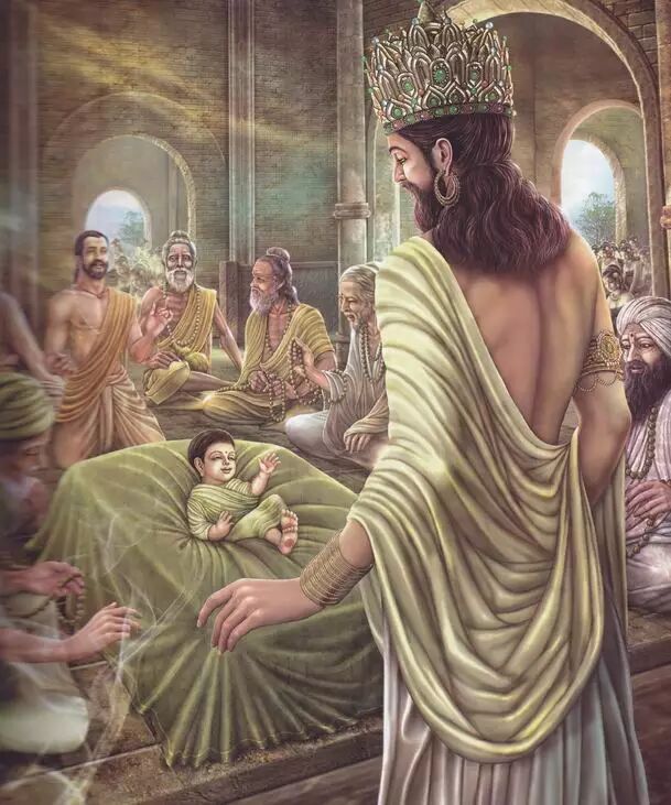 净饭王看到太子和太子妃深受百姓喜爱,心中异常高兴。他发愿从此要静修德行,垂布仁慈,广行德政,亲近圣贤,远离恶友,对臣民要慈颜爱语;日常的生活,要戒除轻举妄动。不但自己一人如此,他更命令大臣及全国的婆罗门,废弃谋权术数,学习治国济世之法,祭祀一切诸天善神,祈祷万民平和安乐,以这一切至诚的为太子祝福。