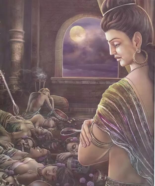 一天夜里她们因为整日劳累不止而纷纷睡去,太子听到烦扰的音乐和歌声停止下来,就从寝室中走了出来,当他经过宫女们歌舞的地方,看到这些宫女原本妖艳的姿容,此刻都已变成种种的丑态,对轮回生起了极大的厌恶,即时生起了出离心。