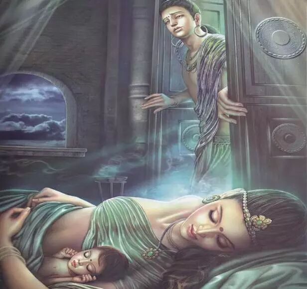 太子看到宫女们的丑态后生起极大出离心,实时下了坚定的决心,他望了睡着的耶输陀罗及罗睺罗最后的一眼,就经过沉睡着的宫女身旁,轻轻的走向车夫住的地方,他要离开这奢华的世间,为众生寻找解脱的道路。